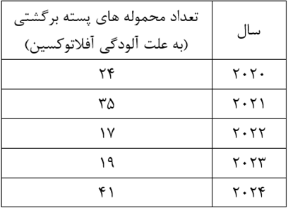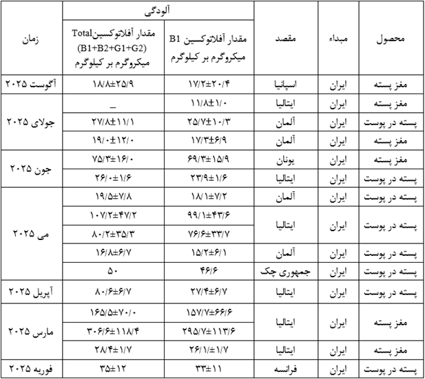 در جدول زیر لیست محموله های پسته برگشتی در ماه های مختلف سال 2025 به همراه مقدار آلودگی آن ها آمده است: