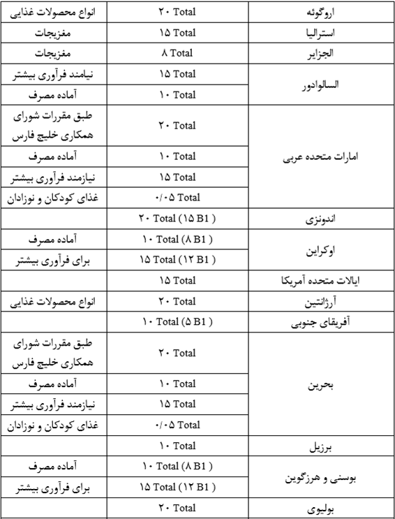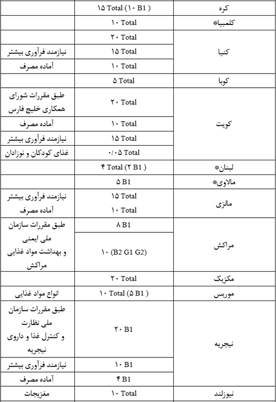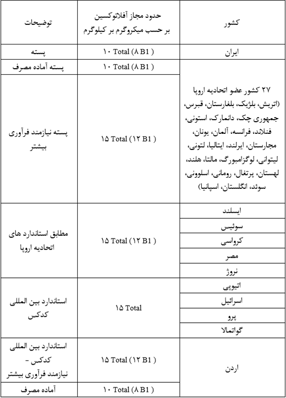 حدود مجاز آفلاتوکسین در کشورهای مختلف، در جدول زیر آمده است: