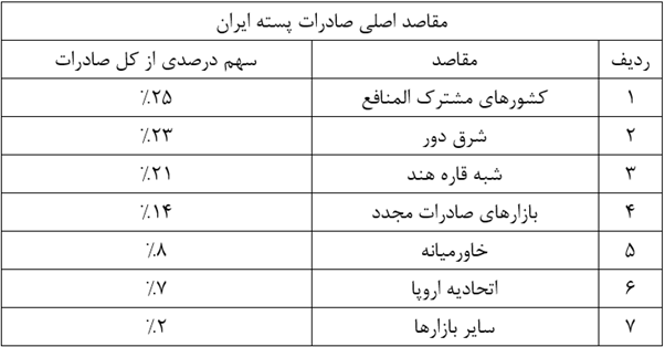 امروزه پسته یکی از اقلام مهم صادرات غیر نفتی کشور محسوب می شود. پسته ایرانی مقاصد زیادی دارد که در جدول زیر آمده است: