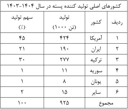 امروزه تولید کنندگان و صادرکنندگان بزرگ پسته در جهان آمریکا، ایران و ترکیه هستند که میزان تولید هر یک از آن ها در جدول زیر آمده است: