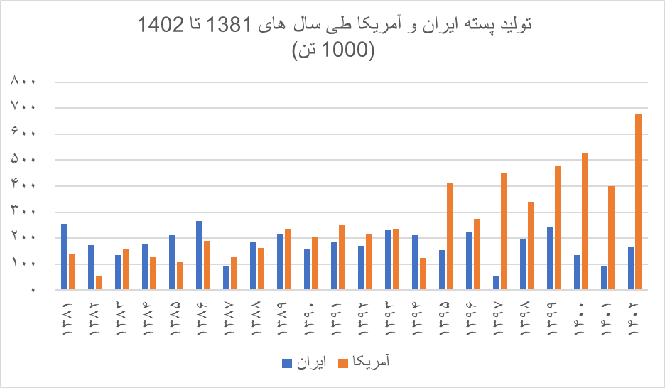 در ادامه نمودار مقایسه ای تولید پسته ایران و آمریکا آمده است: