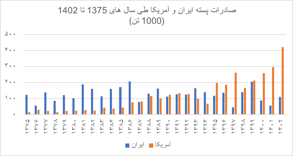 نمودار مقایسه ای صادرات پسته ایران و آمریکا نیز مانند نمودار مقایسه ای تولید نشان می دهد که در سال های اخیر آمریکا از ایران پیشی گرفته است. همان طور که مشخص است، صادرات پسته ایران از 124 هزار تن در سال ۱۳۷۵ به ۵7 هزار تن در سال ۱۴۰۱ کاهش یافته، در حالی که صادرات آمریکا از ۱۵ هزار تن به 422 هزار تن افزایش یافته است.