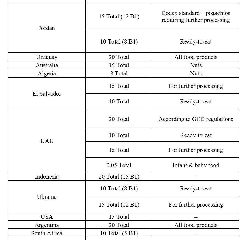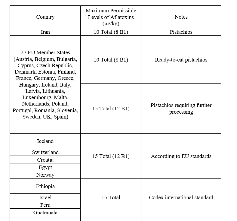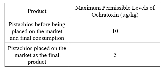 Since the reduction or complete elimination of mycotoxins during pistachio processing is unlikely, failure to comply with maximum permissible levels not only endangers consumer health but also leads to the rejection of export shipments from global markets. Therefore, awareness of the regulatory limits of these toxins in different countries and strict control of their levels in pistachios are both logical and necessary approaches.