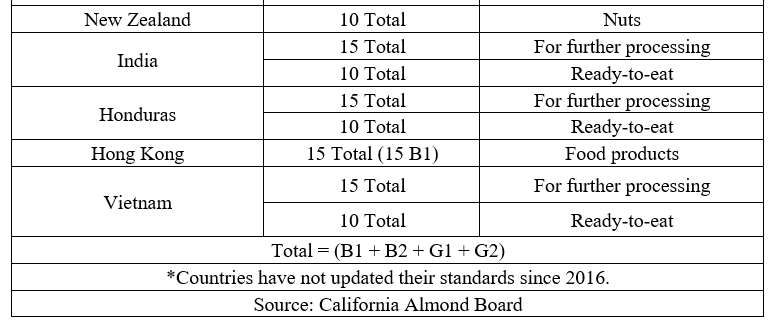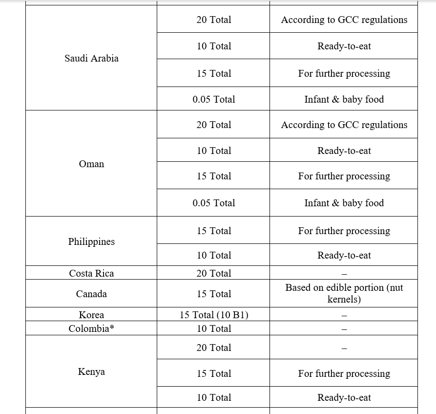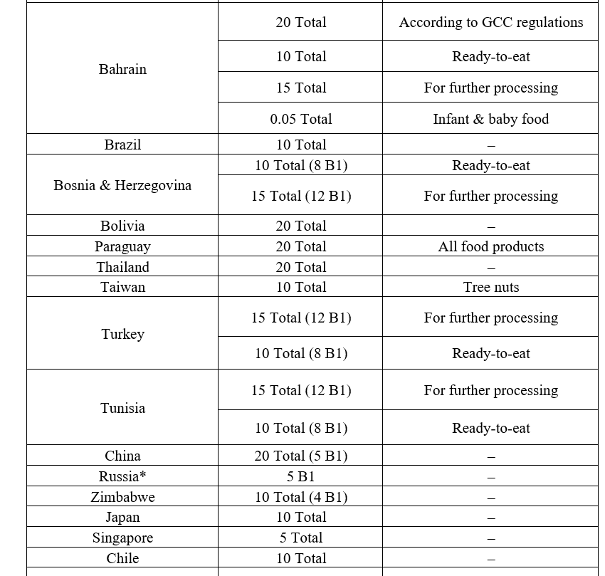 The maximum permissible levels of aflatoxins in different countries are presented in the following table:
