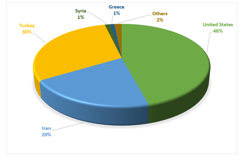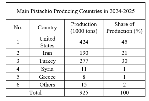 Today, the major pistachio producers and exporters in the world are the United States, Iran, and Turkey, with their respective production volumes presented in the table below: