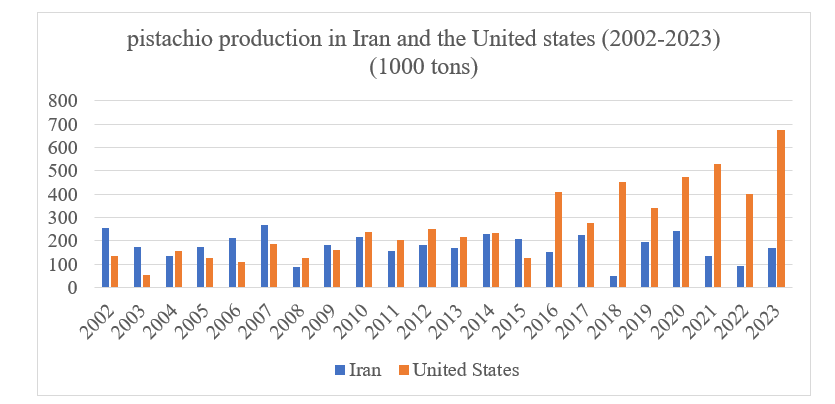 Below is a comparative chart of pistachio production between Iran and the United States: