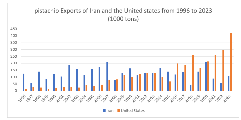 A comparative chart of pistachio exports from Iran and the United States, similar to the production chart, shows that in recent years the U.S. has overtaken Iran. As can be seen, Iran’s pistachio exports declined from 124 thousand tons in 1996 (1375 in the Iranian calendar) to 57 thousand tons in 2022 (1401 in the Iranian calendar), while U.S. exports increased from 15 thousand tons to 422 thousand tons.
