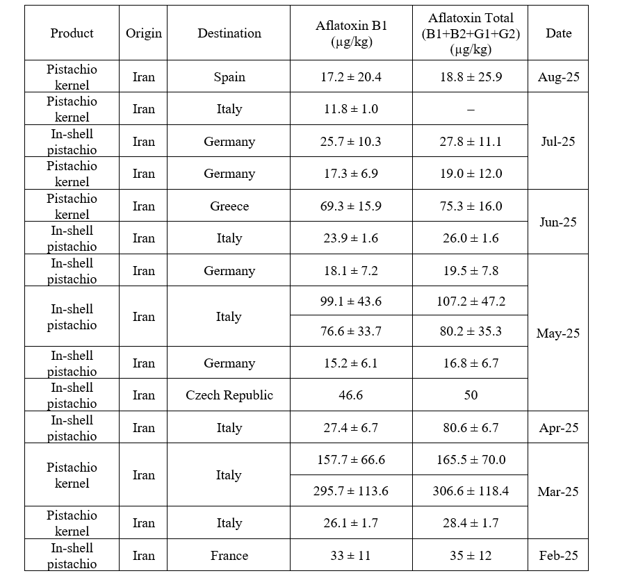 The results from our laboratory are consistent with those obtained from laboratories in European countries, allowing exporters to proceed with greater confidence. Shipping pistachios without accurate testing can lead to shipment rejections and irreparable financial losses. Therefore, it is highly recommended that pistachio exporters have their products tested in reputable food laboratories before any export activity to minimize risks and ensure compliance with international safety standards.